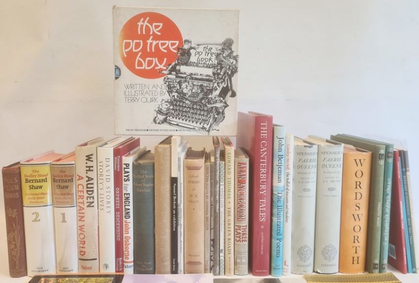 Collection of poetry and plays to include:-Thomas, Edward"The Green Roads", The Bodley Head 1965, illustrated by Bernard Brett, djStorey David"Storey's Lives -  Poems 1951-1991", Jonathan Cape 1992Auden, W H "A Certain World", Faber & Faber 1971, dj Ayckbourn, Alan"Three Plays ...", Chatto & Windus 1977, turquoise cloth, dj Spender, Steven"Selected Poems", Faber & Faber 1951, yellow cloth, djCope, Wendy"Serious Concerns", Faber & Faber 1992, signed and inscribed on tp by the author Quirk, Terry"The Po Tree Box", 3 vols within slip case, Quills Publishing, vol 1 is 2nd edition March 1979, vol 2 Quills Publishing 1979 and The Song Book, Quills Publishing 1980, limp covers, ills and other volumes (38)