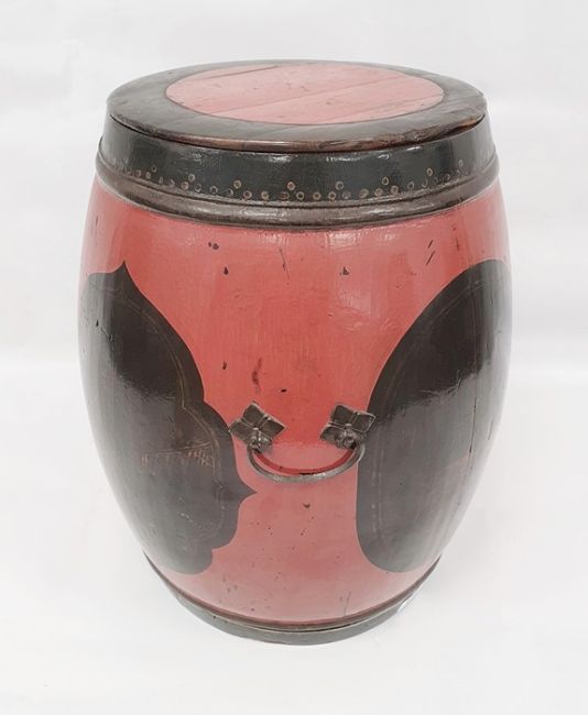 20th century lacquered barrel-shaped Chinese rice box in red and black, with painted fish decoration to the cartouche, 41cm high