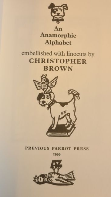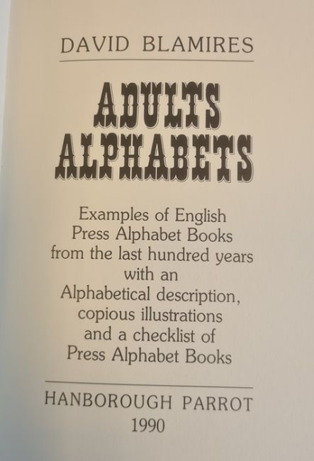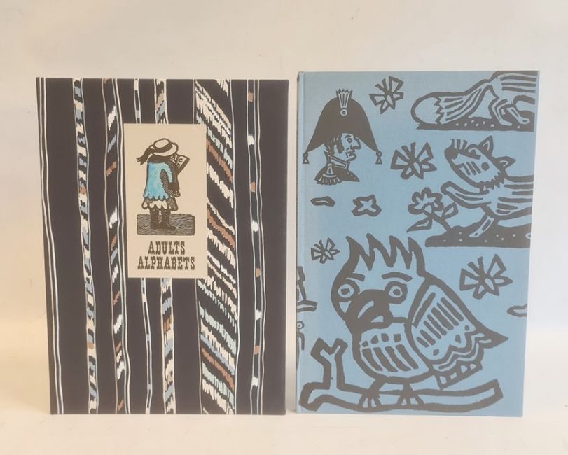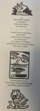Brown, Christopher  (ills.) ' An Anamorphic Alphabet' Previous Parrot Press 1999 , limited edition, number 114 of 136, signed by the illustrator, pictorial blue boards, folio,Blamires David ' Adults Alphabet - Examples of English Press Alphabet Books from the Last 100 Years, with an Alphabetical Description , copious Illustrations and a checklist of Press Alphabet Books' Hanborough Parrot 1990, signed by the author, original publishers binding, folio, (2)