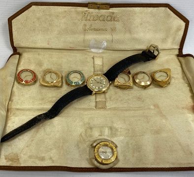 A Nivada watch face with six other watch face surrounds in Nivada Colorama VII bag and a Seiko quartz wristwatch
