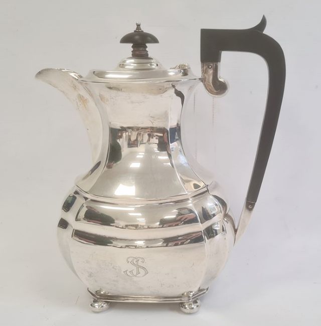 A 1930s silver coffee pot, ebony finial and handle on bun feet, Birmingham 1931, maker S Blanckensee & Son Ltd, 22toz approx. in total, 25cm high
