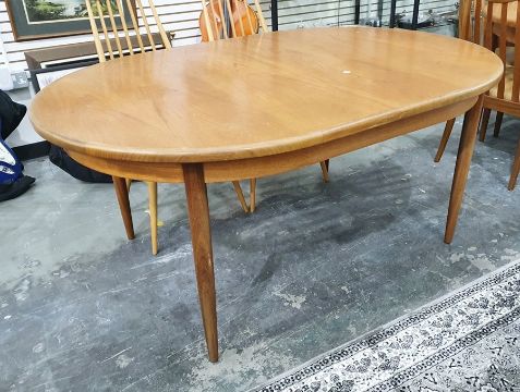 1970's G-Plan style teak extending dining table of oval form on tapering circular supports, 112 x 163cm