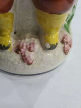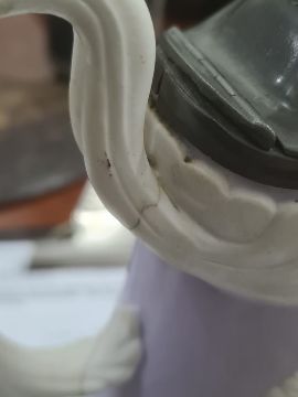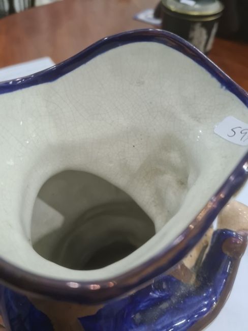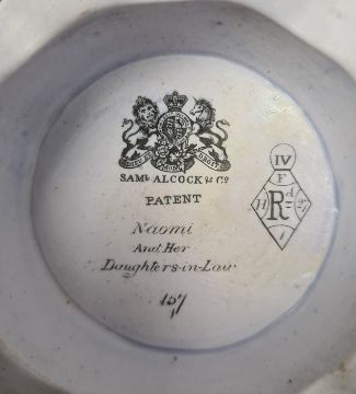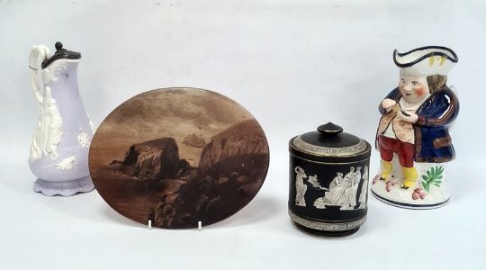 Enamel and lustre glazed 19th century pottery toby jug, 26cm high, Long Park, Torquay, painted terracotta plaque, oval with coastal scene, 27cm high, Samuel Alcock relief moulded and pewter mounted jug with classical decoration 'Naomi and her Daughters in Law', no.157 and a tobacco jar and cover (4) Condition ReportOval plaque - some crazing to topTabaco jar - crazing to the inside, chips to inside rim, chip to sideToby jug - crazingPewter mounted jug - Cracks to handle and the side