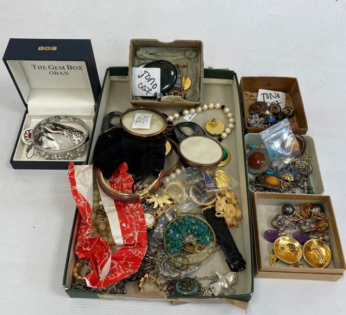 A quantity of silver jewellery and costume jewellery, earrings, clip on earrings, pendants, necklaces, carved ivory parasol handle end etc