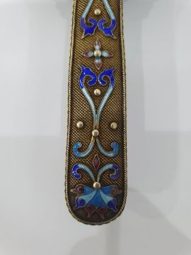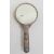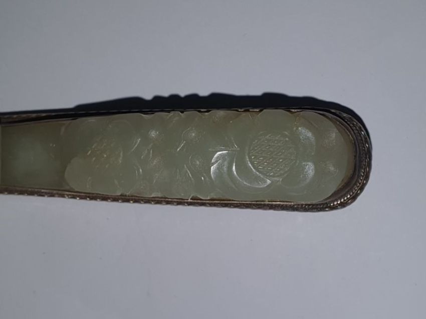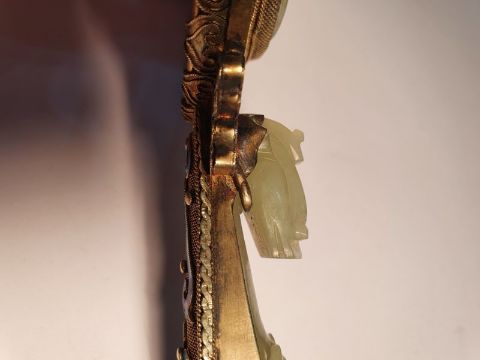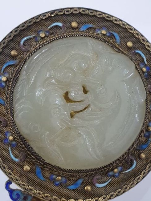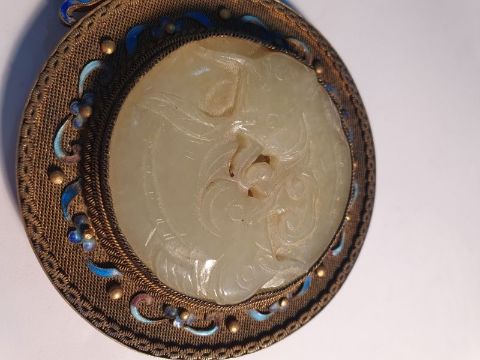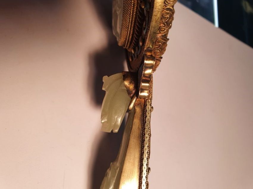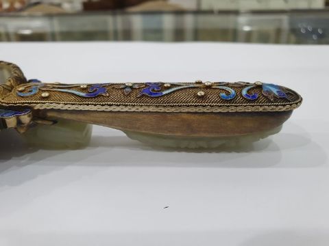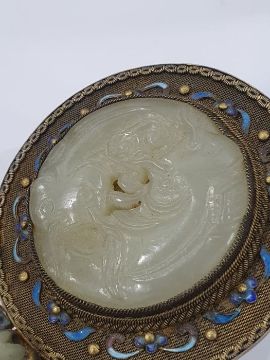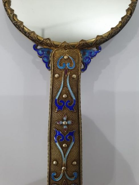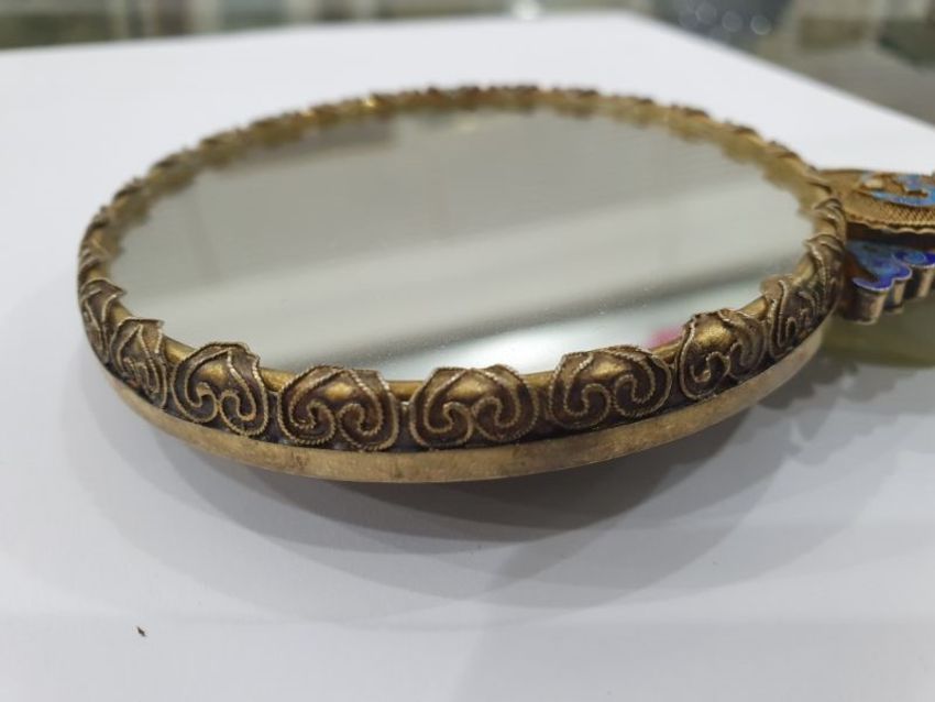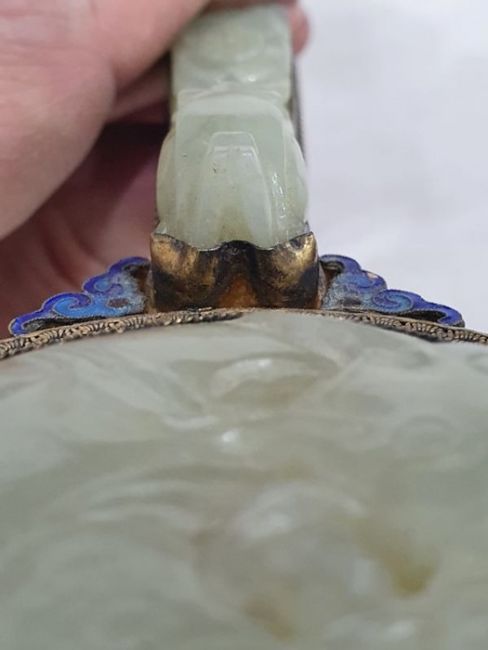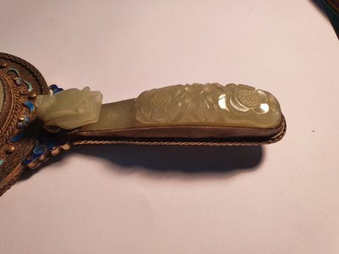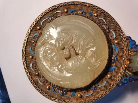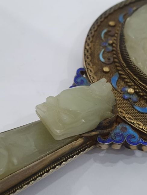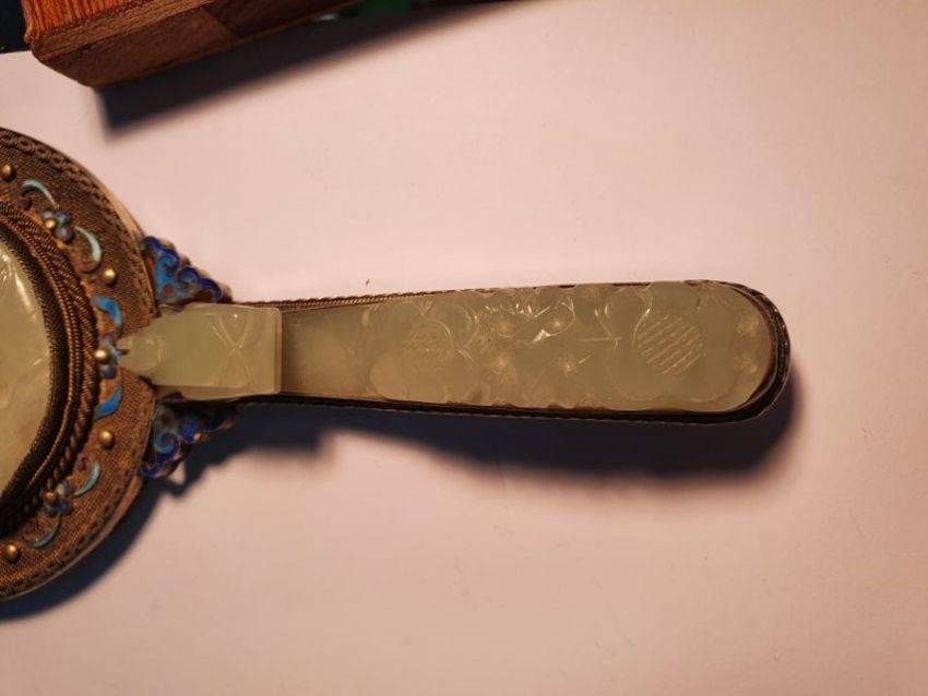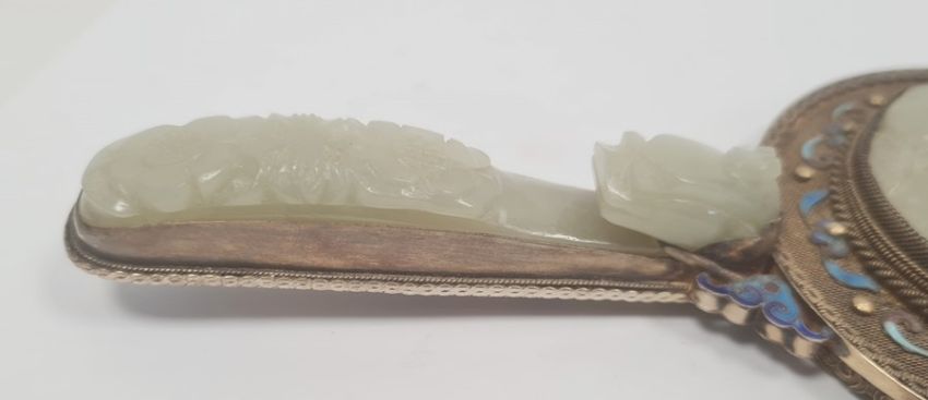 Chinese gilt metal hand mirror, the handle and mirror back each decorated with blue enamel cloisonne scrolling details, the mirror back mounted with a circular carved jade panel depicting carp and the handle set with a carved jade panel in the form of a rui sceptre with floral and serpent decoration, 17cm long Condition ReportSome light surface scratches, accretions and tarnishing.  Some small indentations to the metal around the mirror.  General wear and tear commensurate with age and use, see photos.Silver coloured metal unmarked The weight is 178g.Can't be certain on the date of the jade