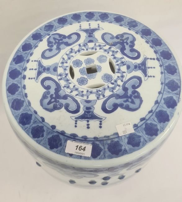 Chinese blue and white barrel seat, the sides decorated with a lake scene and pierced panels, 47cm high