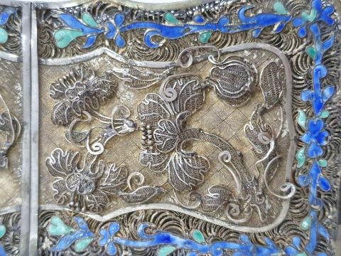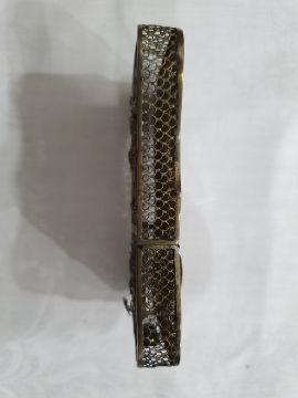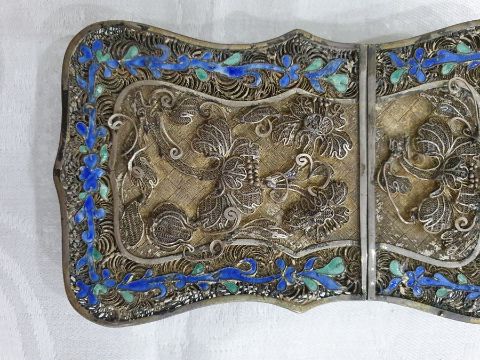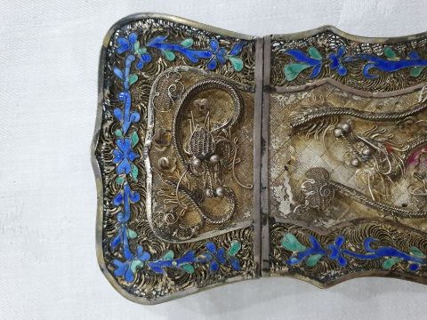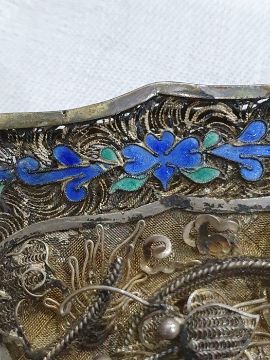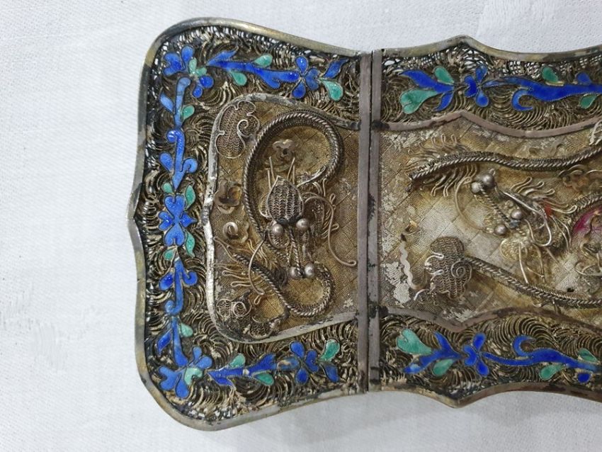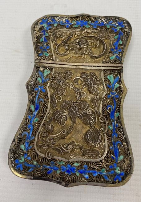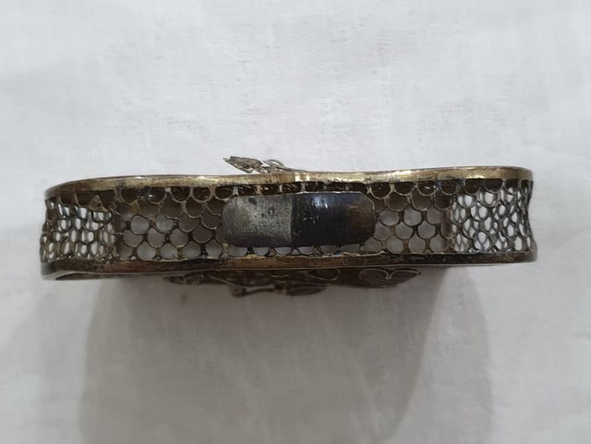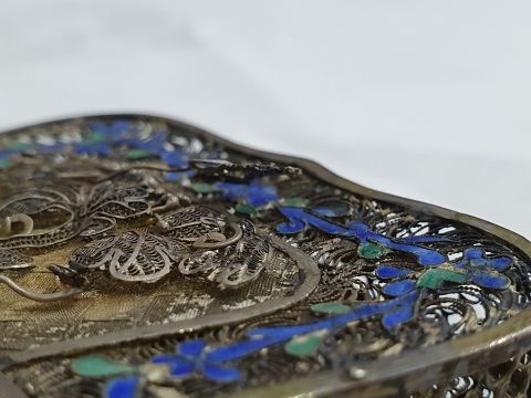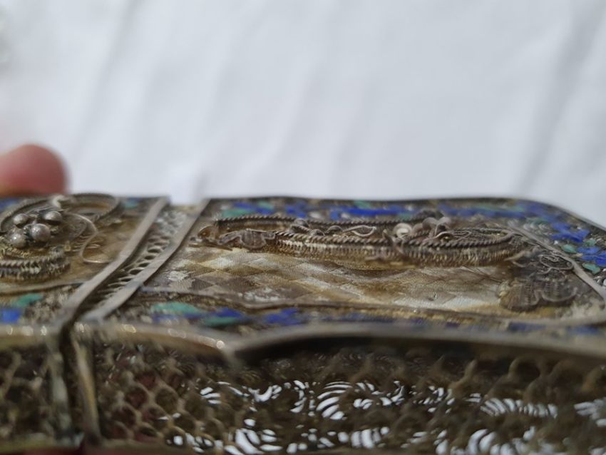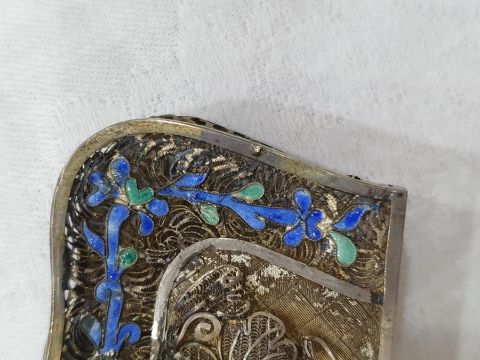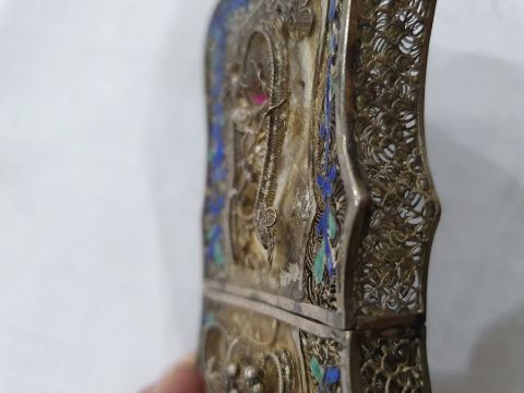 Light surface scratches, accretions and tarnishing. Parts of the filigree are bent, some away from the main body, wear and minor loss to parts of the enamel. minor knocks. There is a split to part of the case. General wear and tear commensurate with age and use, see photos. The weight is 54.4g.