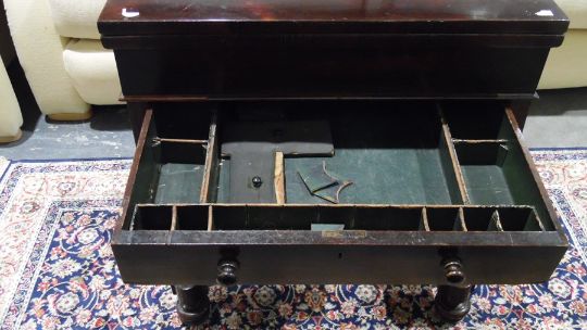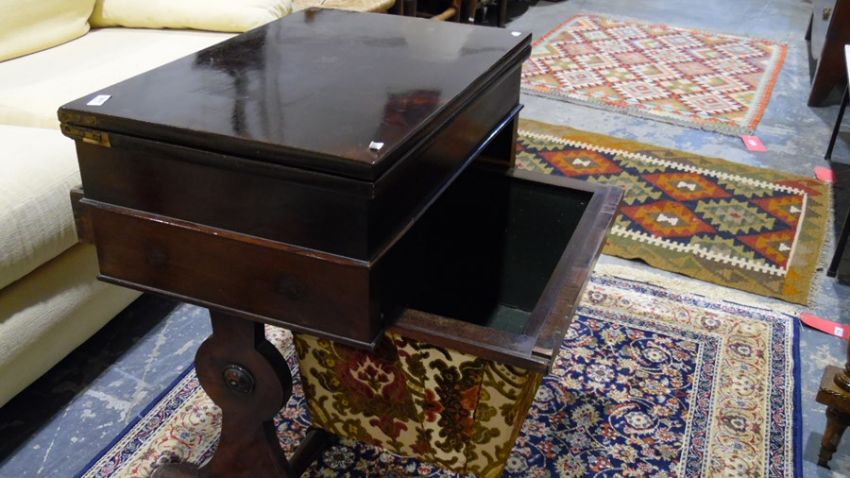 Victorian rosewood work table with hinged swivel top, over a single drawer and sewing basket beneath, turned stretcher, on bun feet, 60cm x 41cm x 74cm high Condition ReportThere are many surface marks, scratches and bumps. One leg/ support is loose and has been repaired.  The top swings through 90 deg and opens to double size. There is a side drawer which opens, there is another drawer and the storage bag which slide out from both sides.