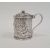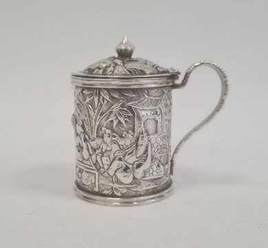 Chinese Wang Hing embossed silver mustard pot, cylindrical and lidded, decorated autour with figures in wooded garden, hinged lid, loop handle and the clear glass liner, stamped to base, 6cm high Condition ReportThe weight with the glass centre is 93.4g. The weight without is 47.8g.