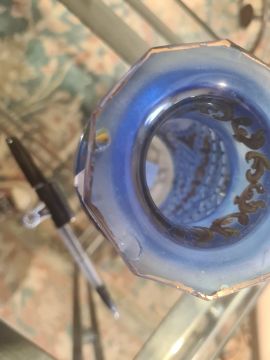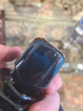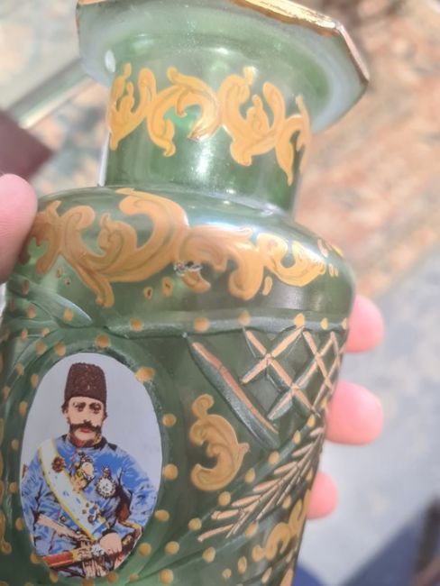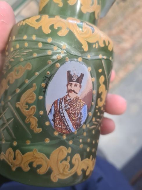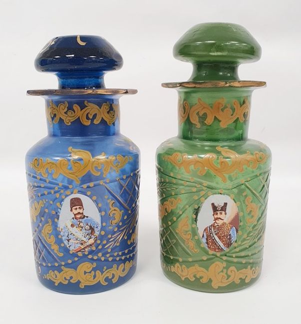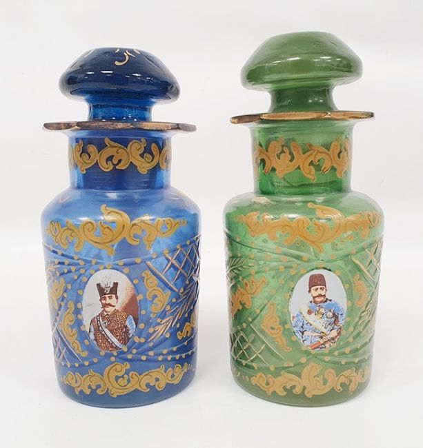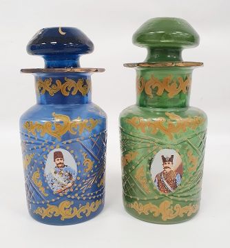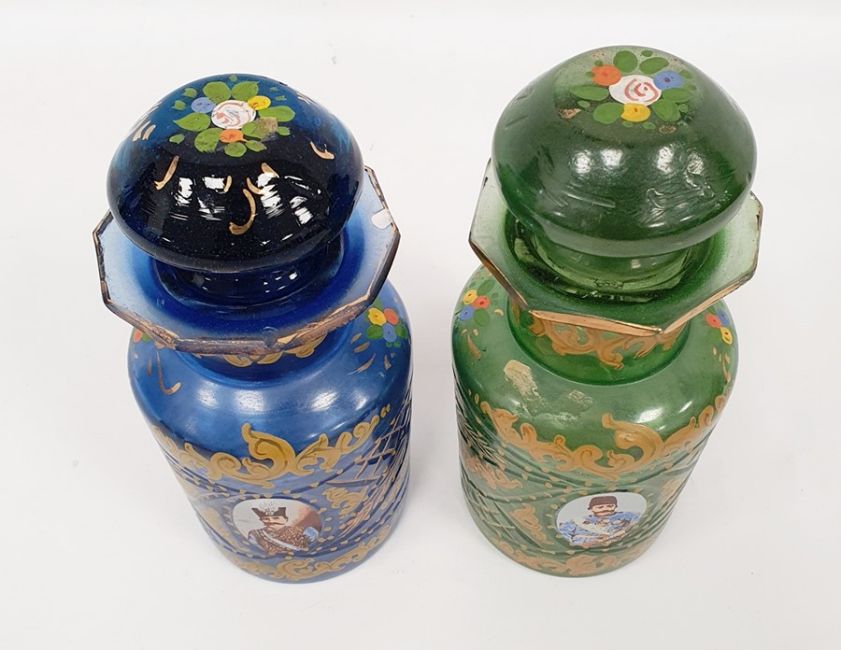 Pair possibly Bohemian stoppered glass bottles with gilt decoration and roundels, depicting moustached uniformed figures, one in green glass and one in blue glass (2) Condition ReportGreen glass - Chip to the stopper, wear to gilt, chips to sides and top.Blue glass - Chip to the stopper, Chips to top, Wear to gilt.See attached images.