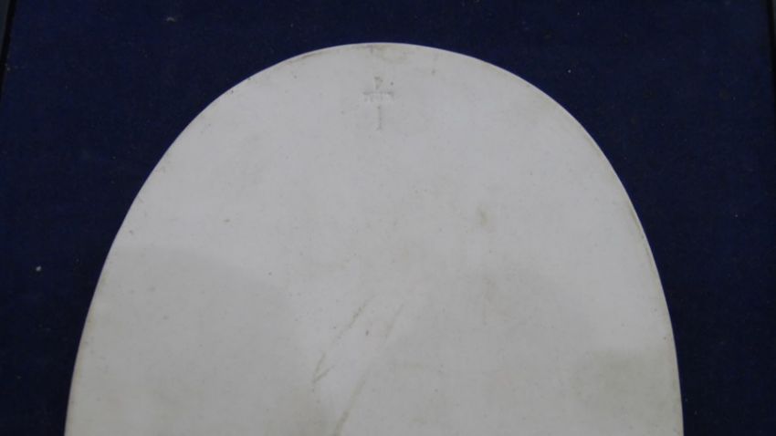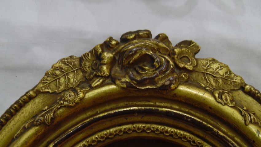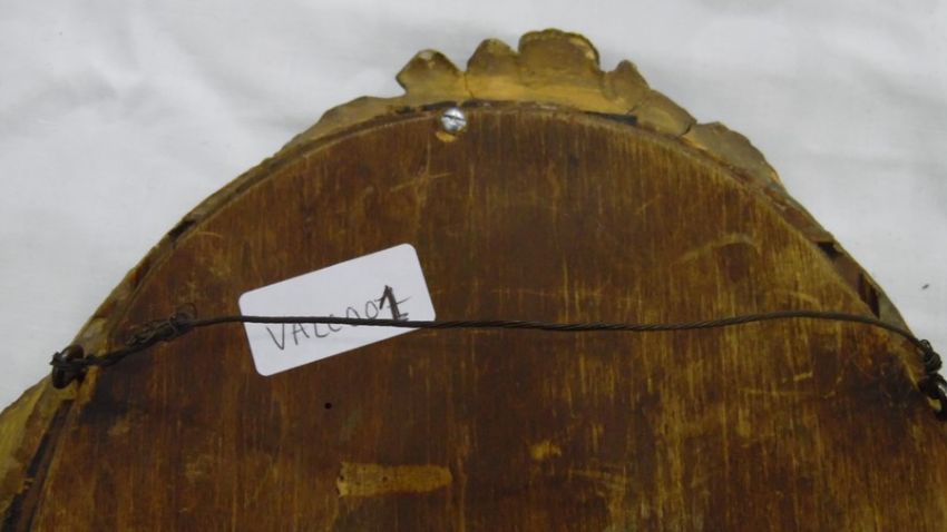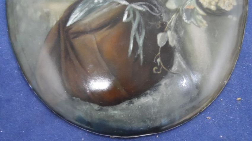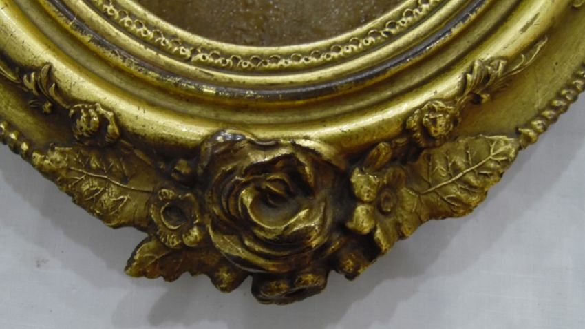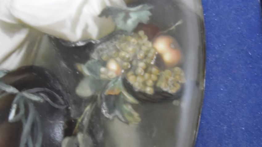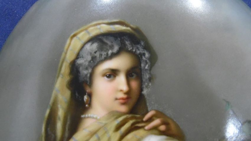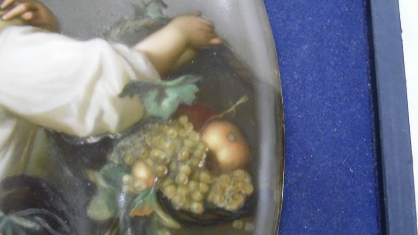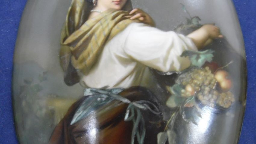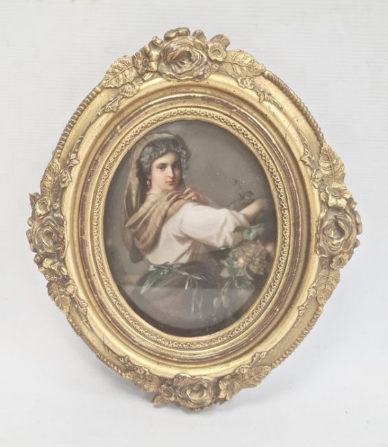 Late 19th century Berlin porcelain plaque, oval and painted with half-length figure of a young woman in headdress and pearl necklace, with basket of fruit, looking back over her shoulder, the plaque 22cm x 16cm, impressed KPM and Septre mark, the gilt wood frame 27cm x 23cm Condition ReportThe frame is fair, there are some cracks and the back is not original and is loose. The plaque has no obvious visible damage. See photos.