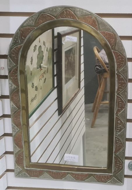 Metal wall mirror of rectangular form with arched top, the frame with tri-colour copper, brass and silvered decoration, 44cm x 29cm