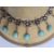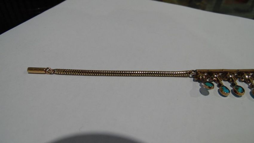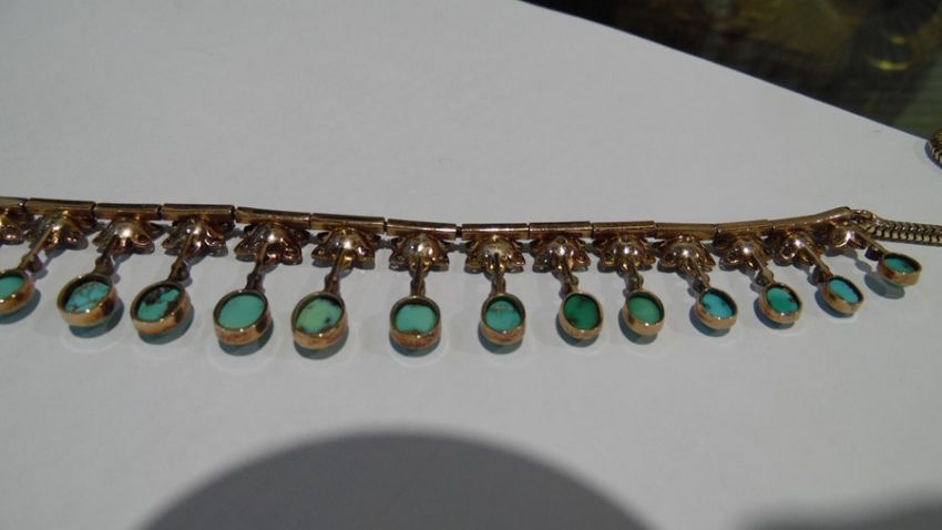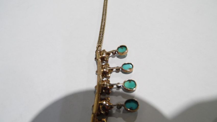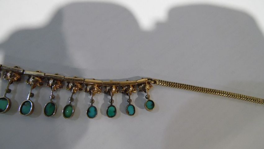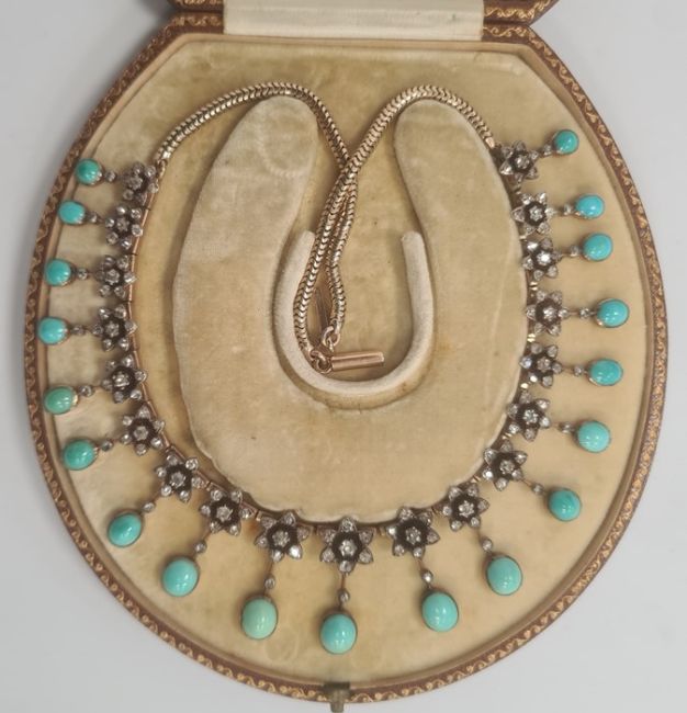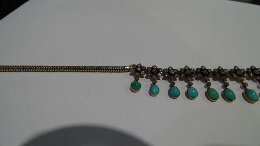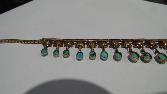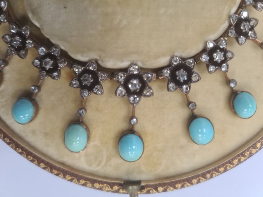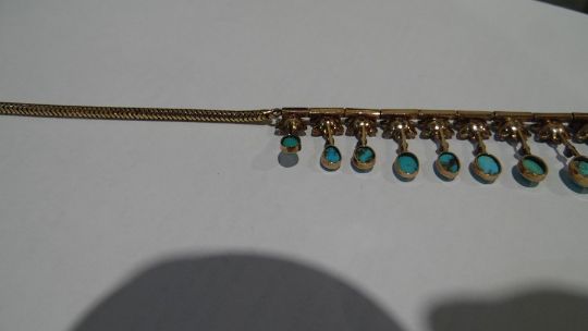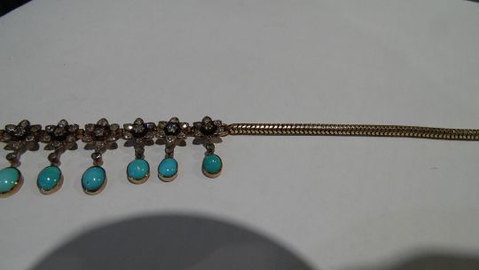 Gold, turquoise and diamond cluster collarette necklace set with 19 flower-shaped diamond clusters, each with suspended oval turquoise drop, each turquoise oval stone 5mm x 4mm approx, in Jays, Oxford Street, London fitted box, 35.5g total approx, necklace length 38cm approx Condition ReportIt is not possible to say whether the chain is original or not. See photo's for your information. Unfortunately, we cannot divulge a reserve if there is one. The item is not marked so it is not possible to state the quality of the gold. The turquoise are generally good with no obvious visible damage or repairs. One is more "naturally mottled on the reverse.