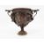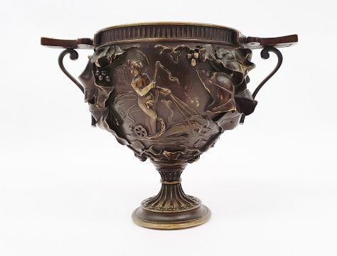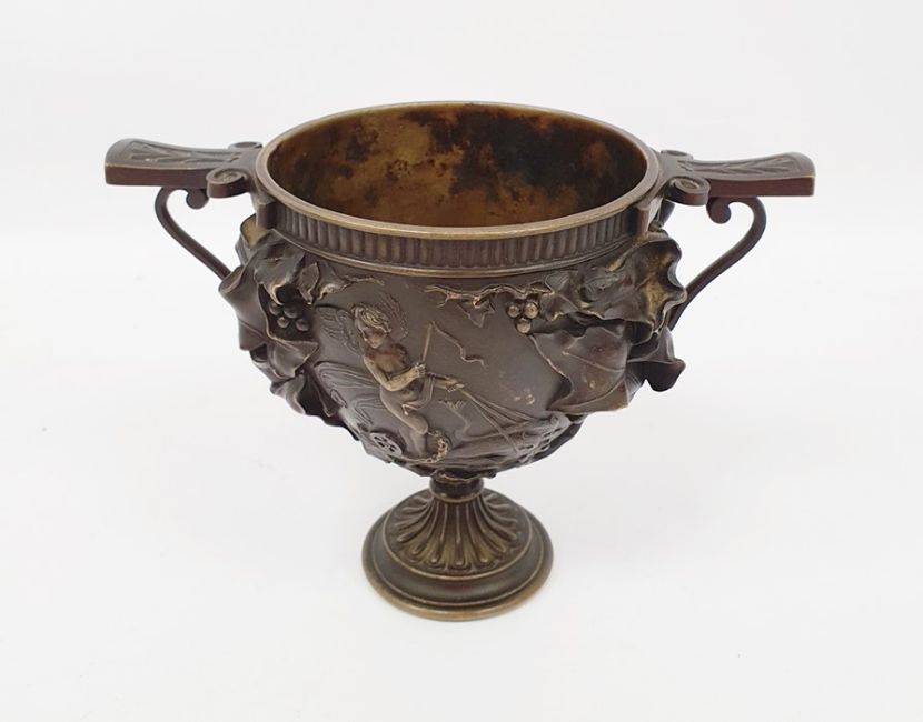 Grand Tour bronze two-handled footed vase with classical allegorical reliefs, viz: putto in chariot drawn by pair of swans and winged nymph in water chariot pulled by two dolphins, all bordered by trailing ivy leaves in high relief, 14cm high