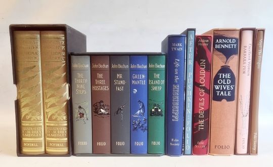 Folio Society - John Buchan boxed set of five, Mark Twain, Pushkin, Aldous Huxley, Arnold Bennett, Barbara Pym and Virgil, all within slip cases  Malory, Sir Thomas "Le Morte d'Arthur", facsimile, published 1985 by The Boydell Press,limited edition, No. 60/500 copies, illustrated by Aubrey Beardsley, fawn buckram with Art Nouveau gilt designs to front and back board and backstrip, within a slip case