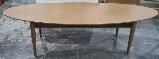Two modern IKEA Stockholm oval coffee tables in oak finish, on four turned supports and light oak coffee table with rounded ends, on chrome supports, marked underneath 'Brevettato', 180cm long (3)