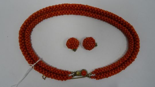 Silver and coral collarette with matching clip-on earrings, all set with multi-beads, the clasp marked '800', boxed Condition ReportWe have not confirmed/ tested the coralWe cannot confirm whether it has been dyed