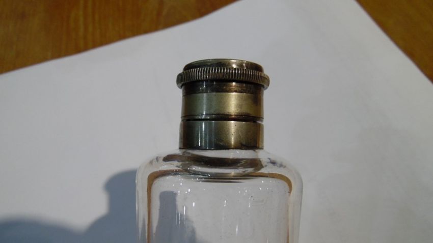 Glass hunting flask in brown leather holster Condition ReportCork seal is perished. Some minor nibbling on glass opening, otherwise no obvious damage. The top has a small crack above the hinge. It is engraved P.I.B - as is the leather case. The leather is fine if a little dry. See added pictures