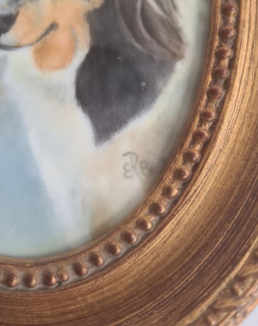Painted porcelain plaque, oval, head and shoulders study of a dog 'Amber' by E R Booth, ex Royal Worcester artist, 11cm x 7cm, gilt framed