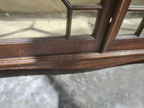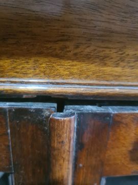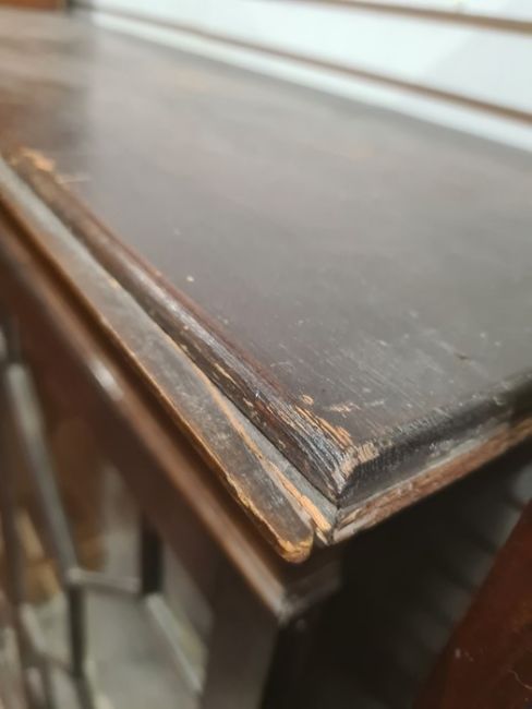 There is a split to the top as well as wear to both the top and the base. The handle on the door has been broken off. There is damage to the base on the left. See attached images.