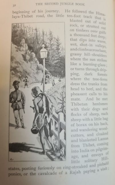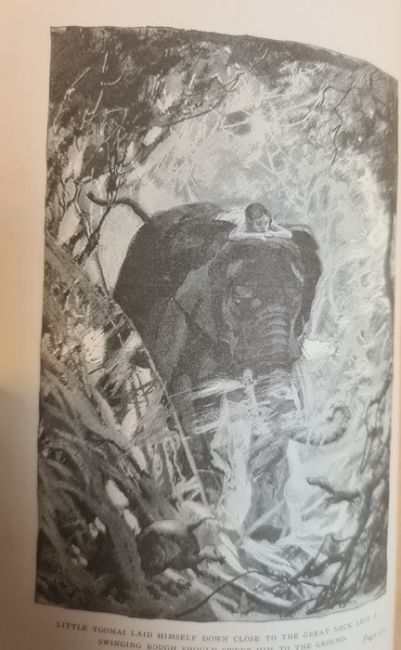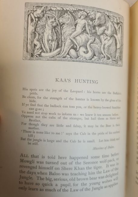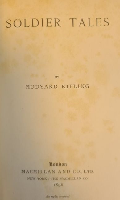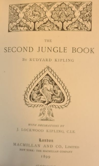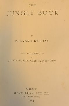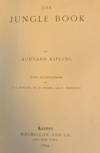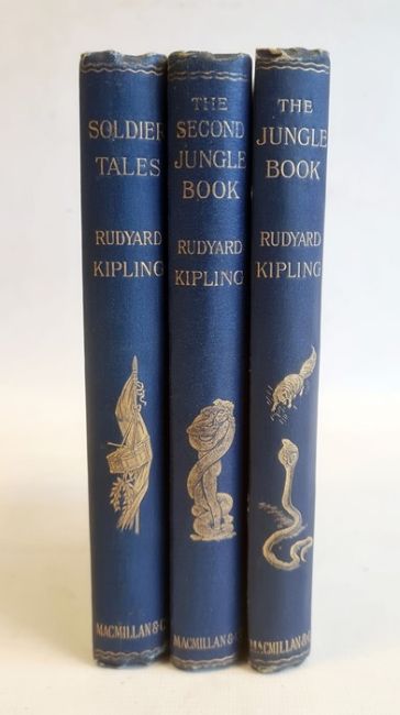 Kipling, Rudyard  'The Jungle Book ' ills by J.L Kipling, W H Drake and P. Frenzeny, Macmillan 1894, frontis with tissue guard, hinge cracked page 64/65, some light foxing, dark green endpapers, blue cloth with gilt pictorial front board and back strip, corners bumped and top and bottom of the spine, slight rubbing on one of the gilt elephants, with ' The Second Jungle Book decorations by J.Lockwood, Kipling Macmillan & Co. 1899, slight foxing on endpapers, aeg, blue with gilt pictorial cloth and backstrip, 'Soldier Tales' Macmillan & co.1896, frontis with tissue guard, foxed, black endpapers, blue with gilt pictorial cloth, aeg, corners bumped and a pin prick to the edge of the front board (3)