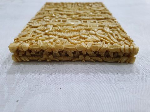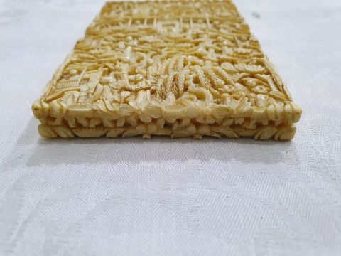 A 19th century Chinese Canton carved ivory card case, relief of figures amongst buildings and trees, 11.3cm x 7.3cm Condition ReportSome discoloration and staining, some accretions. General wear and tear commensurate with age and use, see photos.Approx 75 grams