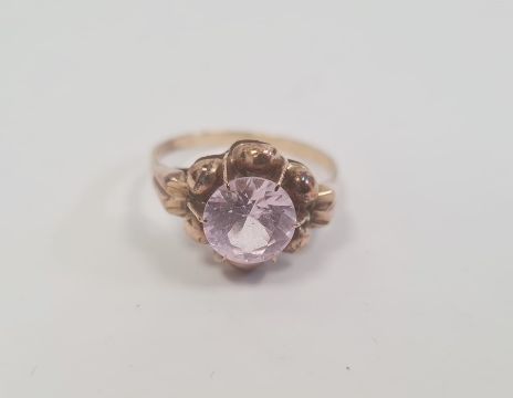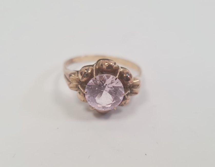 18ct gold and amethyst(?) circular set ring, the circular pale purple stone 8mm diameter, 2.4g total (ring size Q approx)