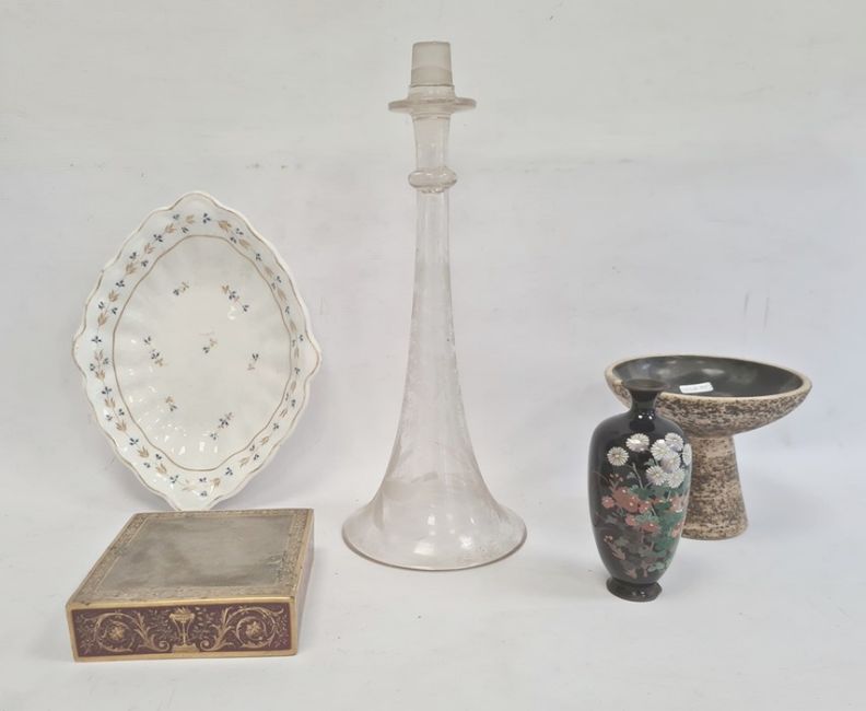 19th century Derby porcelain dish, fluted oval and decorated with cornflowers, 28cm wide, Vienna porcelain square pedestal stand with neo-classical scrolling gilt decoration on a burgundy ground, 13.5cm diameter, etched glass epergne vase, small Japanese cloisonne enamel vase and stoneware stem bowl (5)