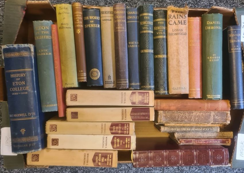 Churchill, Winston "The Second World War", 4 vols, The Reprint SocietyThackeray, W M"The Newcomers", 2 vols, Smith Elder & Co 1896, illustrated by Richard Doyle, green blindstamped cloth with gilt titlesMaxwell Lyte, H C "History of Eton College 1440-1898", Macmillan & Co 1899, backstrip chippedParker, Eric"Eton in the Eighties", Smith Elder & Co 1914, blue cloth, gilt titlesGeorgette Heyer, 5 titles Charles KingsleyNaomi Jacob Folio society"The Travels of Marco Polo ..." The Masterpiece Library of Short Stories, 20 vols, all with quarter morocco, red cloth, gilt decorated and titled backstrips (3 boxes)