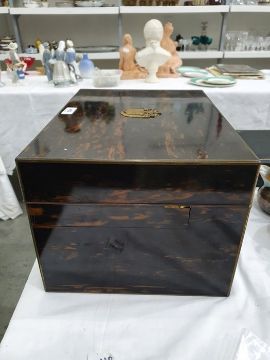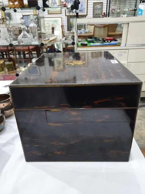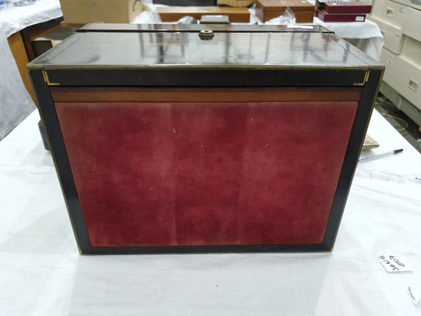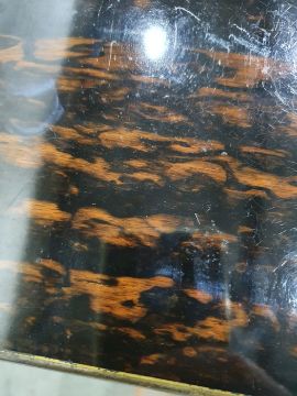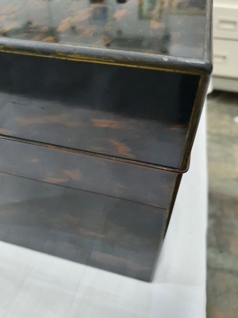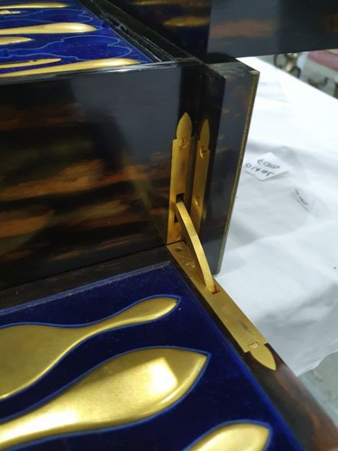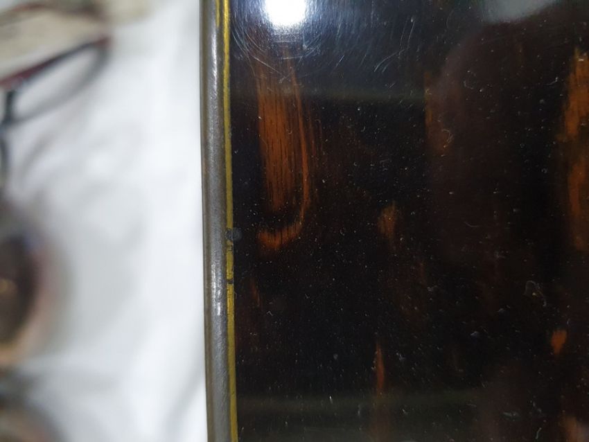 Numerous light surface scratches, some minor scuffs to wood & brass, tarnishing to brass. Mechanism works smoothly. some pairs of scissors missing, scratches to some of the lids. General wear and tear commensurate with age and use, see photos