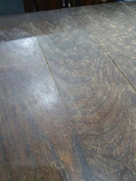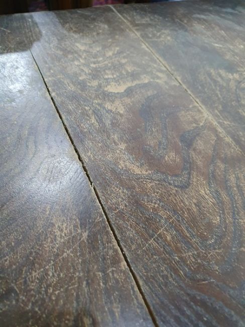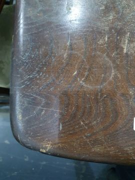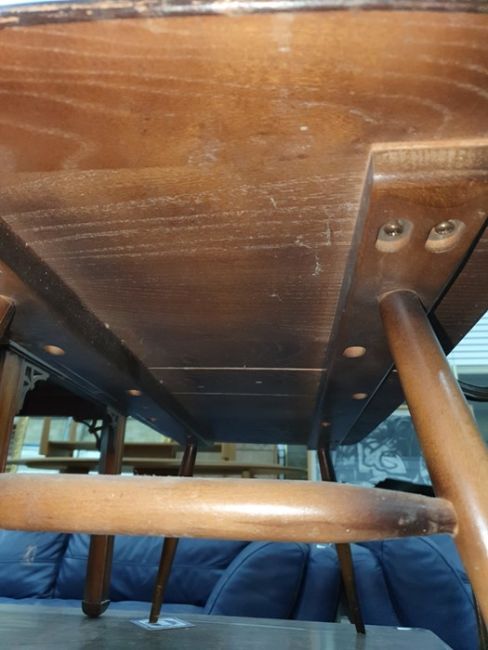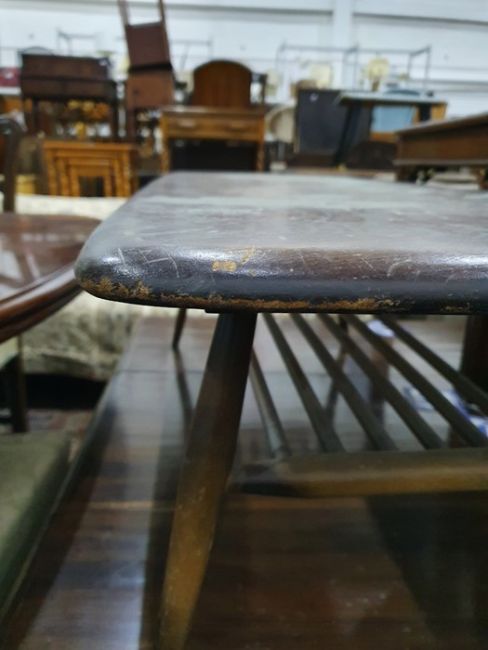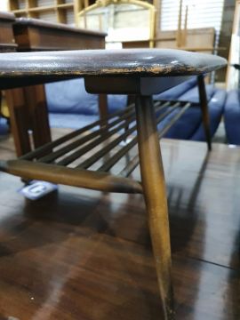 Dark elm Ercol coffee table with magazine rack under, 105cm x 36.5cmCondition ReportNumerous scratches, scuffs and knocks and stains to the wood.  Heavy wear to the top, loss of varnish.  Three splits to the top running the entire width. See photos.