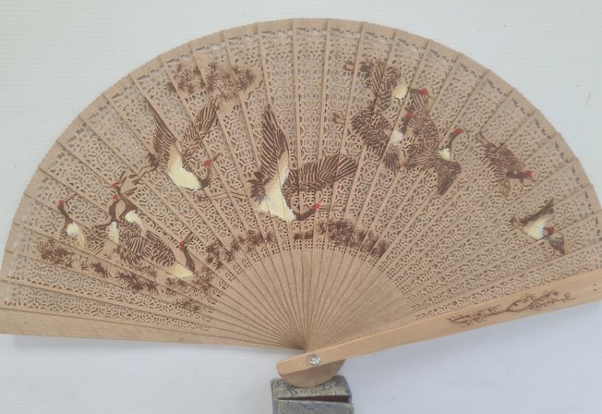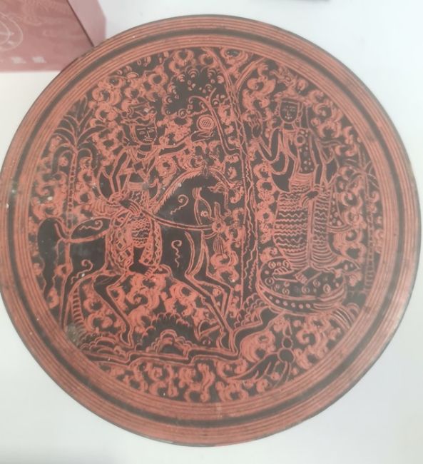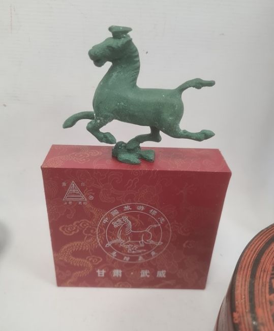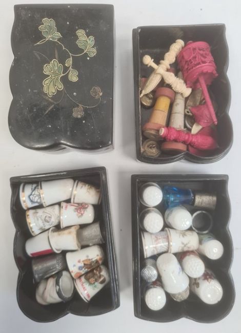 Red lacquer box of circular form, the pull-off cover painted with figure on horseback, the interior with trays, a number of other black lacquer boxes of floral decoration, Chinese fan in case and other items