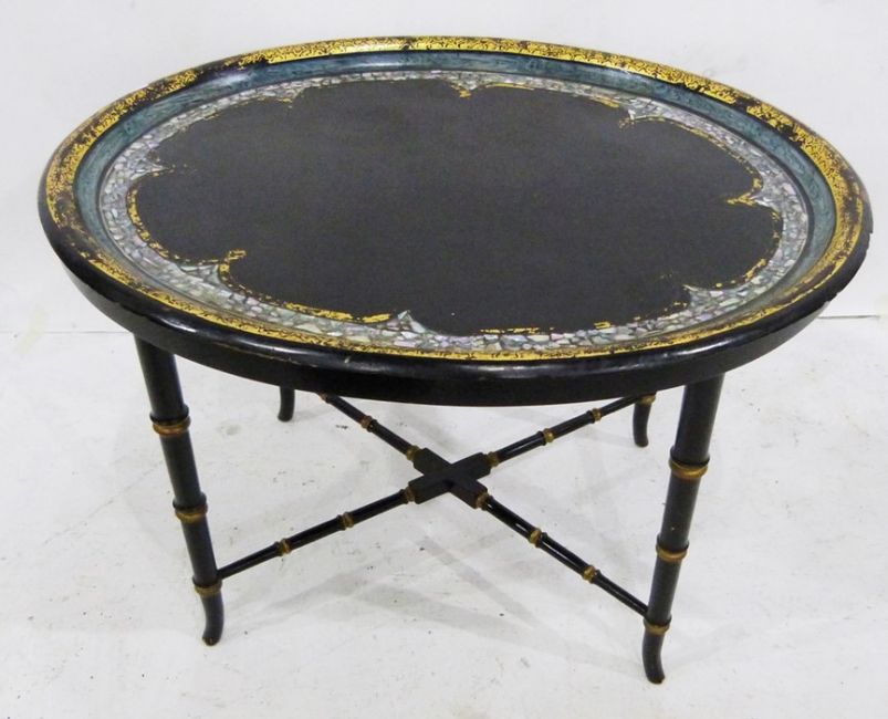 Oval centre table with papier mache and mother-of-pearl inlaid tray top, on ebonised bamboo-effect base, 78cm wide