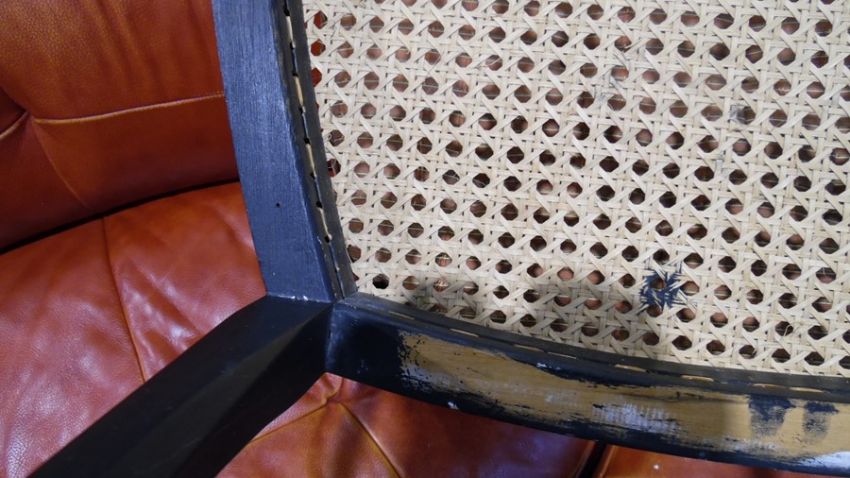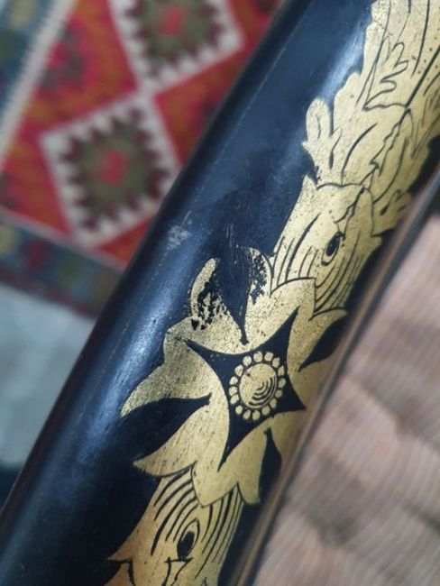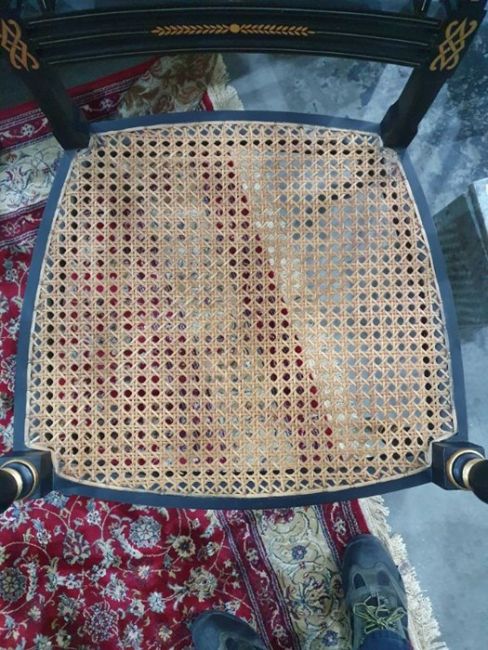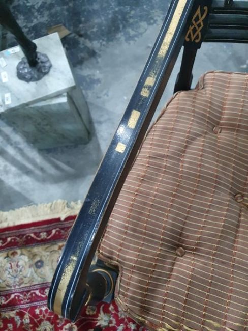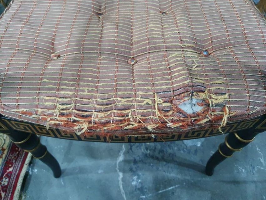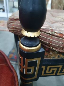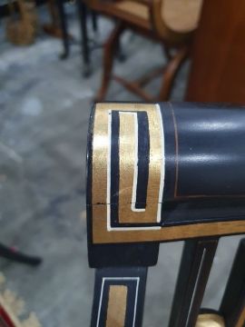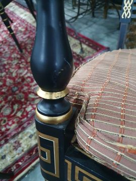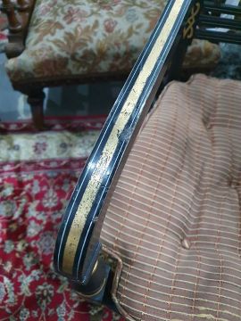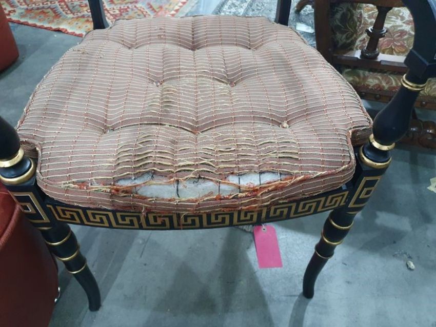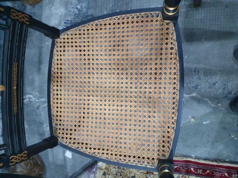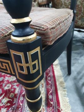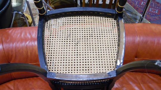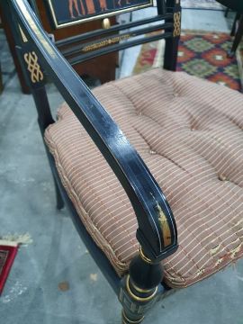 Set of six Regency-style ebonised dining open arm chairs, each with a panel decorated with classical figures and with gilt decoration, with cane seats and squab cushions (6) Condition ReportNumerous light surface scratches, some scuffs and knocks to the wood, wear to the gilt in areas, predominantly to the arms.  some of the back panels are a bit loose.  Damage to the cane at the front of one of the chairs. Fraying to some of the cushions.  General wear and tear commensurate with age and use, see photos.