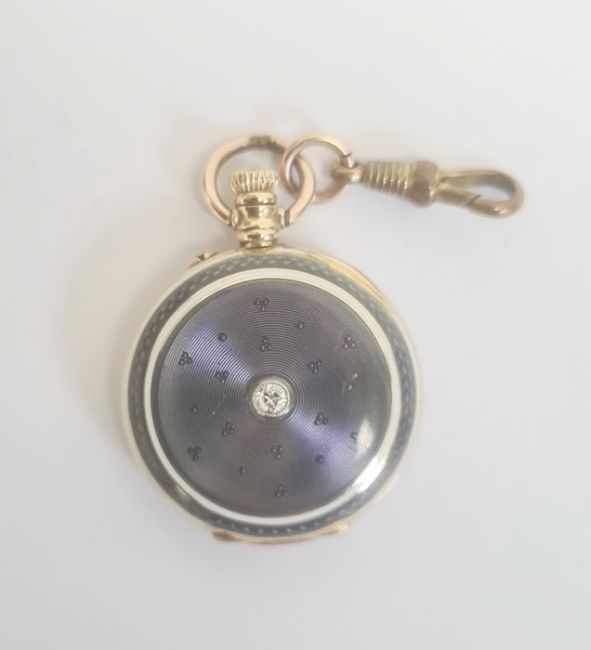 Lady's 18ct gold, enamel and diamond fob watch, the face with guilloche enamel borders and lavender-coloured back inset with central diamondCondition Reportwe do not guarantee any watches
