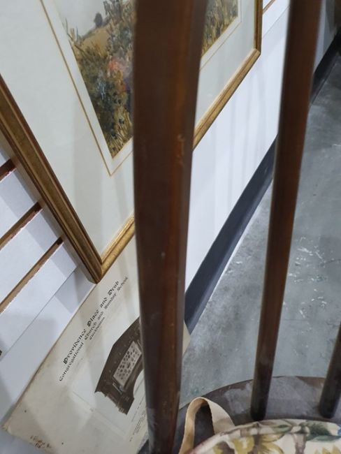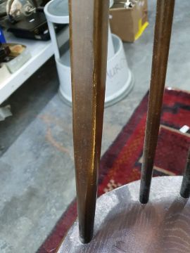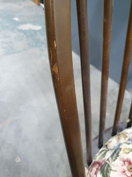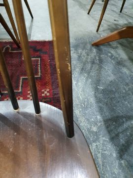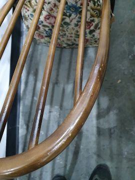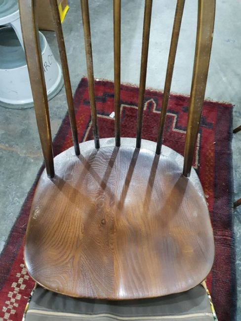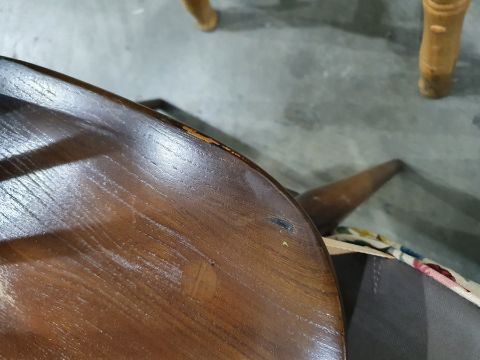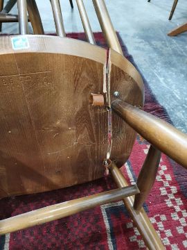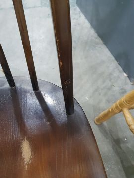 They appear to be stained light elm. All have numerous scratches, scuffs and knocks and accretions.. Wear, fading and discoloration to the backs, seats and legs. One of the seats is completely split in two. General wear and tear commensurate with age and use, see photos.