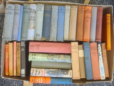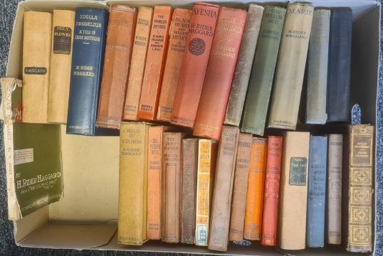 Haggard, Rider, large quatity of titles"Ayesha The Return of She", Ward Locke (nd), red cloth, black titles and description"The Yellow God", Cassell & Co 1911, green cloth, black titles, all rubbed and worn "Maiwa's Revenge: or The War of the Little Hand", Longmans Green & Co 1888"The Brethren", Cassell & Co, reprinted October 1904, red cloth, gilt titles and more volumesBuchan, John - quantity of titlesBrett-Young, Francis - quantity of titles  ( three boxes)