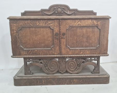 20th century oak sideboard, the rectangular top with rounded front corners, moulded and carved edge, two cupboard doors above the plinth base, 120cm x 100cm