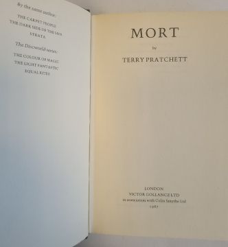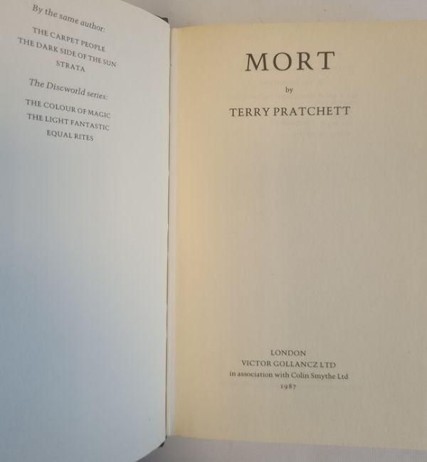 Pratchett, Terry ' Mort' Victor Gollancz Limited in association with Colin Smythe Limited, 1987, black cloth, gilt titles to back strip, dustjacket. not price clipped