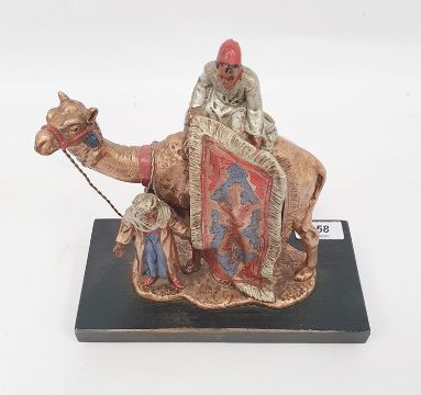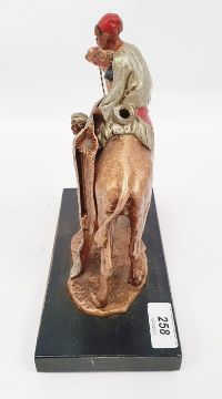 Franz Bergman style coal painted spelter table lighter in the form of Arab carpet seller on camel, 19.5cm high and the ebonised wood rectangular base