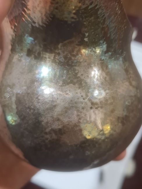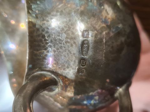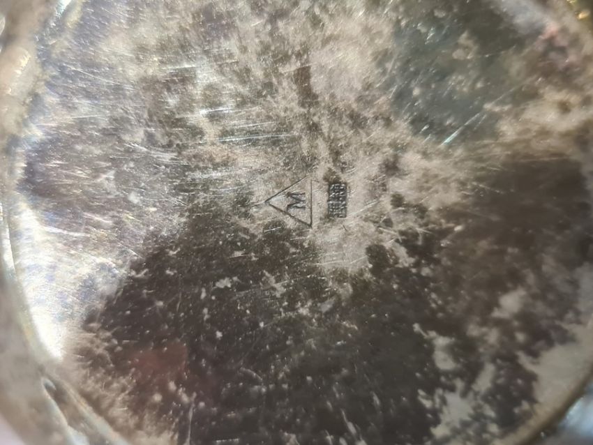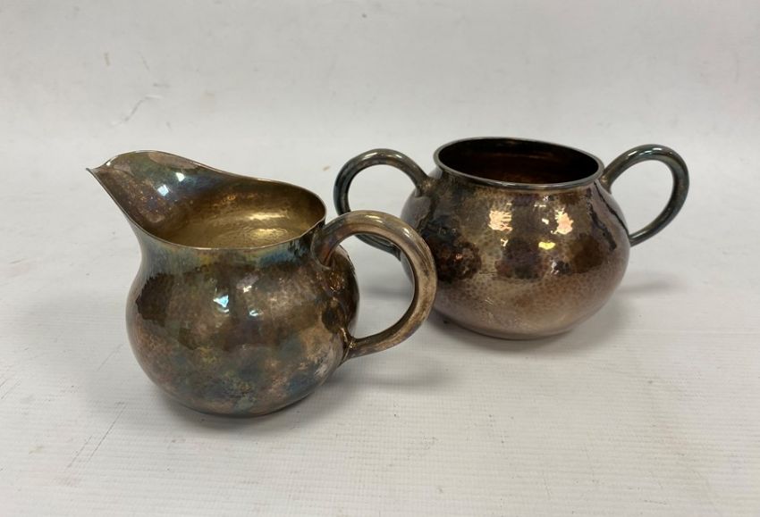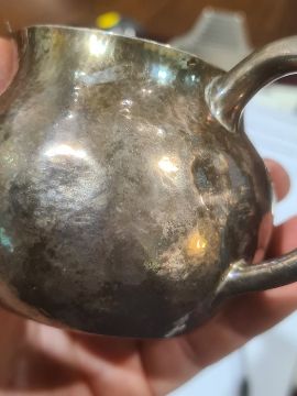 There are 2 dents to the jug near the handle and the handle looks like it could be slightly bent to one side. Both pieces have some spots of wear to them on the sides and bases. They are marked see attached images.