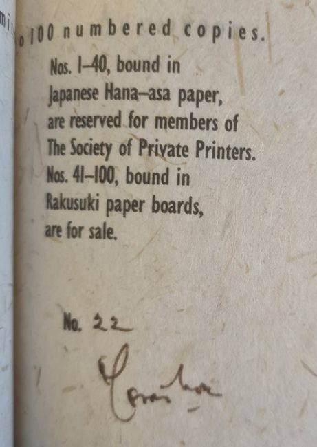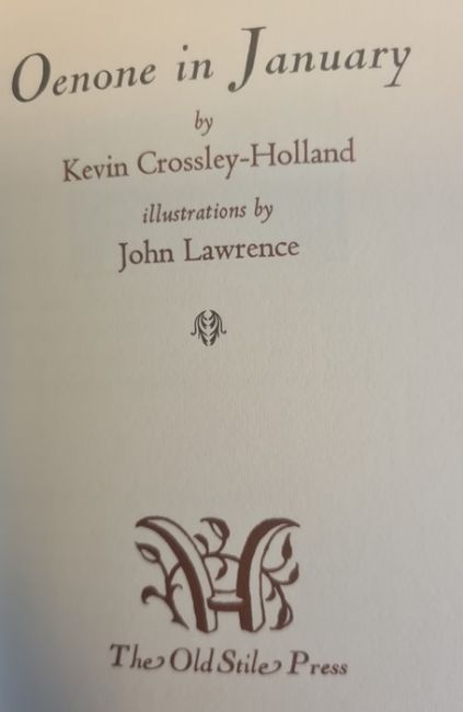 Private Press -Crossley-Holland, Kevin ( text)  Lawrence, John ( ills) 'Oenone in January'  The Old Stile Press, September 1988, text paper Zerkall mould-made, 350 numbered copies signed by both author and artist, number 277 of 350, signed in pencil on the back free end-paper, pictorial boards ,Cox, Morris  '14 Triads'  Gogmagog Press, edition limited 100 numbered copies, number 1-40 in Japanese Hana - asa paper, reserved for the members of The Society for Private Printers, number 22, signed , uncut, label 'This edition is sent to members of The Society of Private Printers with the compliments of the Printers' and a compliment slip from the Gogmagog Press,Priestner, Wills ( ills.) ' The Compleat Angler or the Contemplative Man's Recreation....written by Izaak Walton' published by Hanborough Parrot 1990, ills throughout, printed on Zerkall mould-paper, numbered edition of 135 , unnumbered, signed by the artist, ills endpapers, illustrated boards, Weissenborn, Hellmuth ( ills.) and D'Arcy Kaye ( text) ' Columbus' the Acorn Press, limited edition, number 129 of 200 numbered and signed copies by both artist and author, uncut, pale sage coloured  boards with ribbon stitching and slip case ( 4)