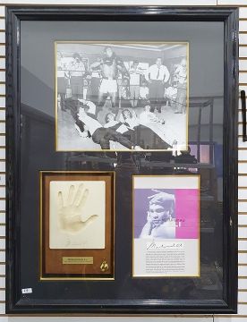 Mohammed Ali framed and glazed photograph, part biography and hand print