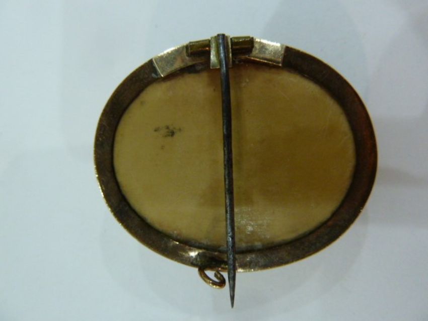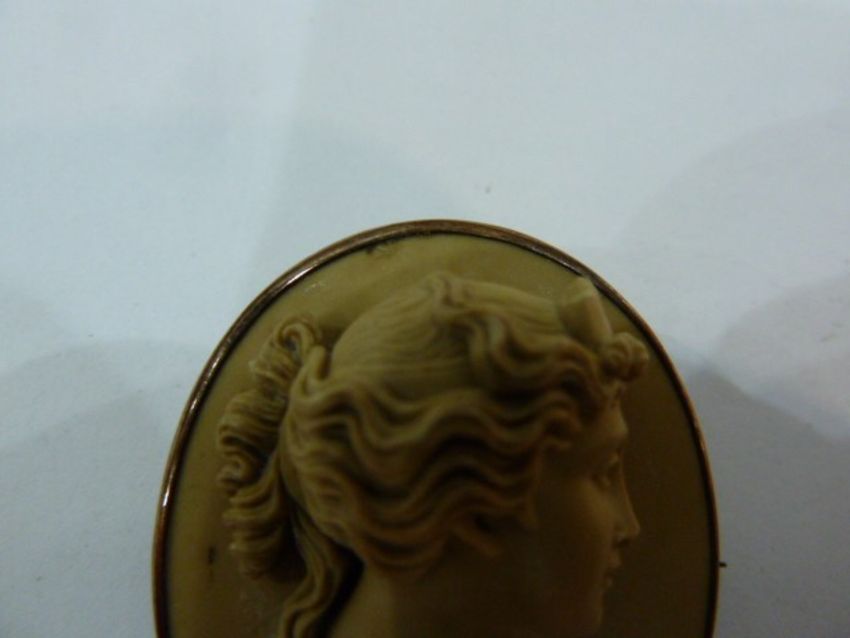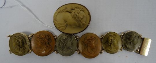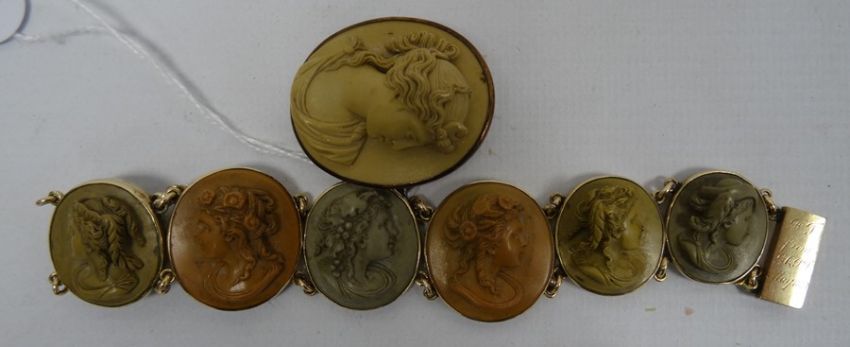 Gilt metal lava stone cameo pendant and gilt metal lava stone cameo bracelet with engraving to the clasp 'To J from GQPJ May 1873' (2) Condition ReportThe bracelet weighs 32g approx. The pendant weighs 12.2g approx. Clasp on bracelet works. Slight damage on top edge of brooch. See attached pictures.
