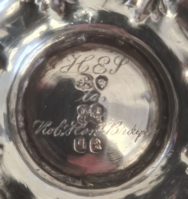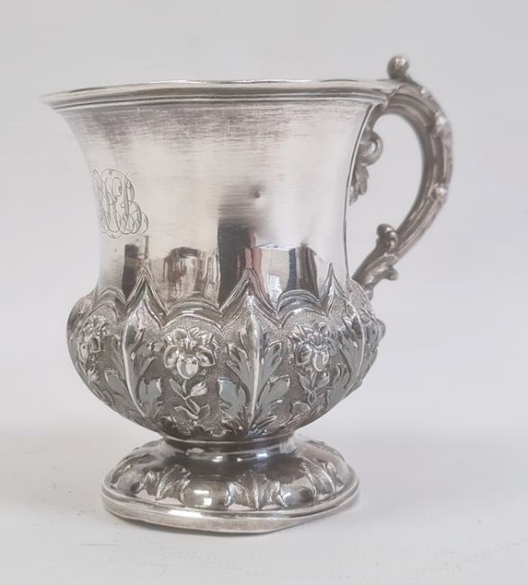 A William IV silver christening mug, engraved 'RHB', floral repousse decoration, parcel gilt interior, London 1831, maker Edward, Edward Junior, John and William Barnard, 3.7toz. approx. 10cm high