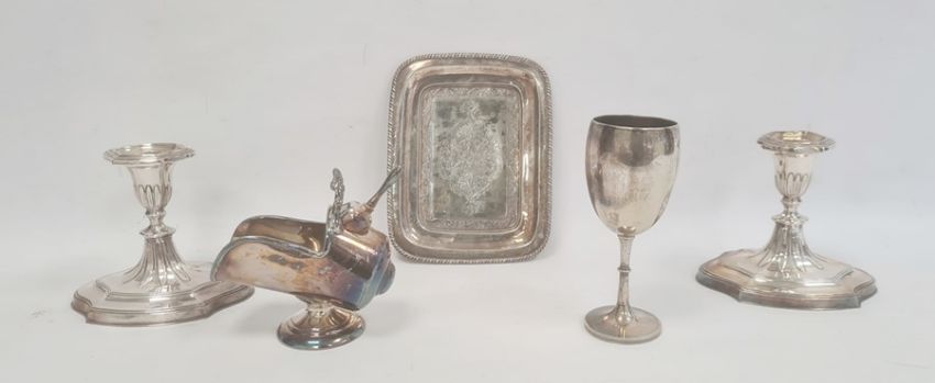 A Mappin and Webb silver plated cup, a silver coloured metal miniature rectangular tray, a pair of squat candlesticks and a salt (5)