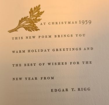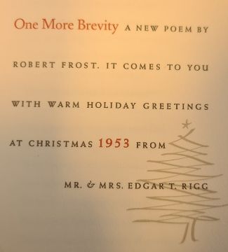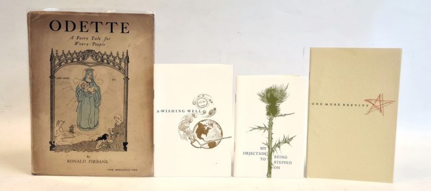 Frost, Robert ( 1874-1963)  poetry - three Christmas cards 'My Objection to Being Stepped On' Christmas 1957 from Mr and Mrs Edgar T Rigg, wood engravings by Leonard Baskin, 'One More Brevity....' Christmas 1953 from Mr and Mrs Edgar T Rigg, decorations by Philip Grushkin, 'The Wishing Well' Christmas 1959 from Edgar T Rigg, wood engraving by Thomas W Nason, with Firbank, Ronald 'Odette, a Fairy Tale for Weary People'  Grant Richards Limited, St, Martins Street 1916, ills by Albert Bruher, limp covers, owns stamp on ffep ( 4)