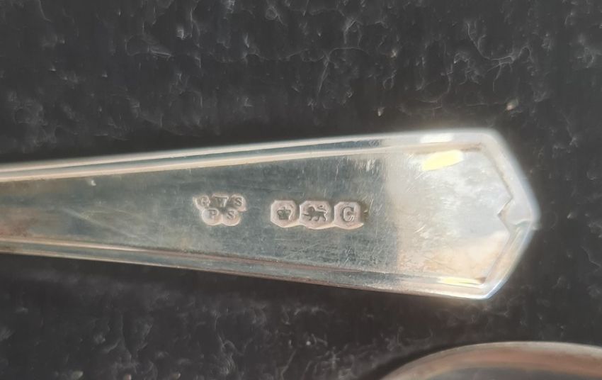 A cased set of six 1940s silver tea spoons, engraved to the handle M, Sheffield 1949, maker GW Shirtcliffe & Son,  2.9toz. approx. an early 20th century silver square shaped dish, with pinched edges, Birmingham 1904, makers mark worn, 1.9toz. approx.10.2cm approx. and a cased matched set of mother of pearl handled and stainless steel tea knives