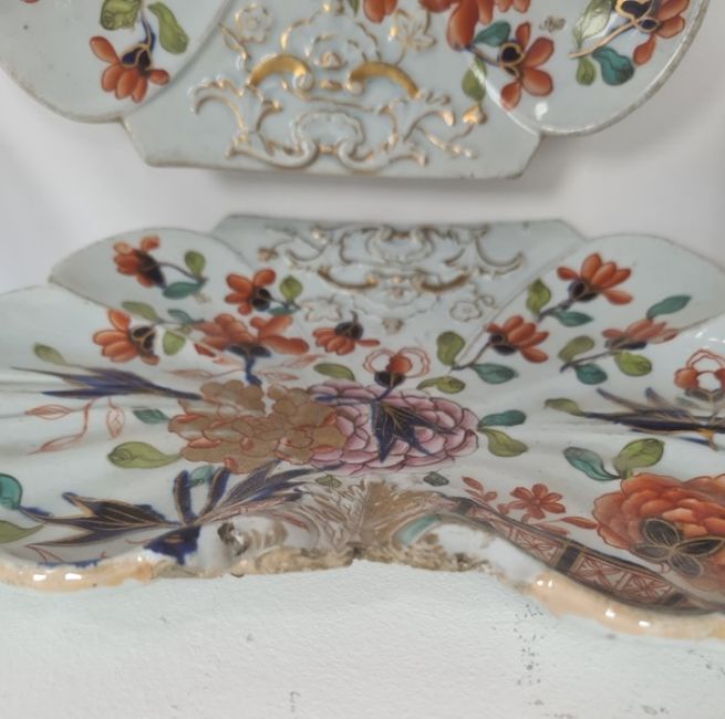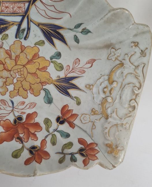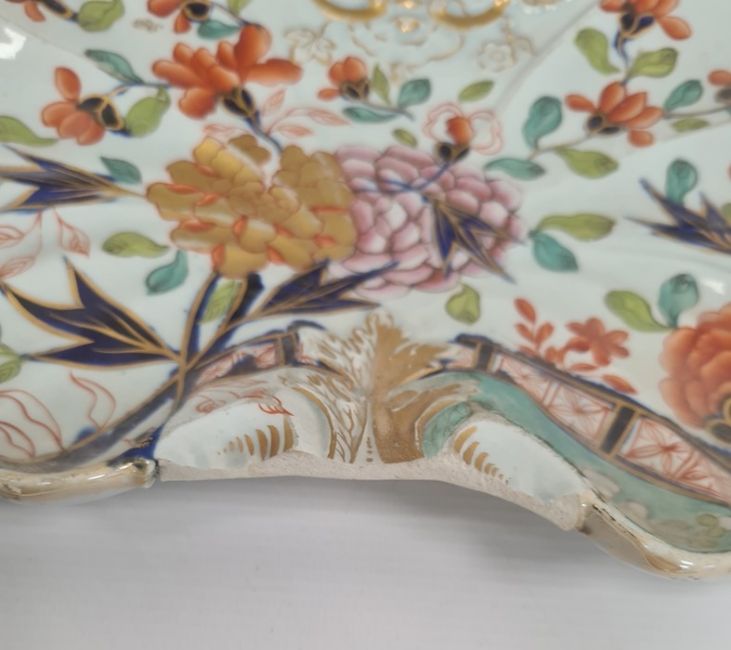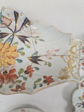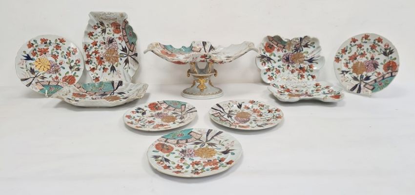 Early 19th century Masons 'Patent Ironstone China' part dessert set to include pedestal serving dish with panelled outswept scroll top, on pierced gilt fern decorated and beaded stand with oval base, decorated with chinoiserie flowers, trellis fence and gilt highlights, 38cm wide (repaired), two shaped and scalloped serving dishes to match, two shell shaped dishes to match and five small plates (some with damage)