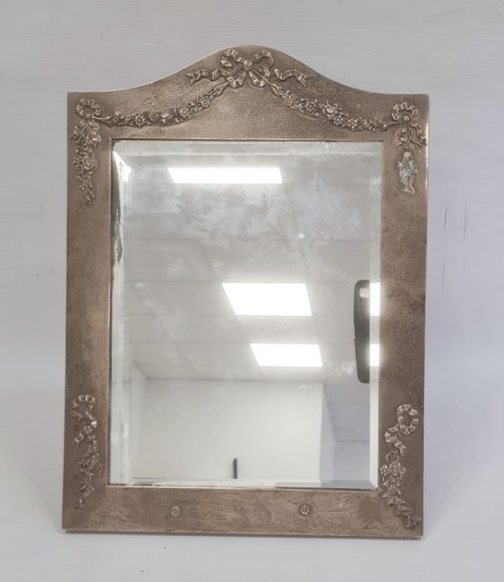 Large silver dressing table mirror by Albert Barker Ltd, London 1904 of rectangular form with arched pediment, applied floral swags (some loss) and with easel frame, 37cm high